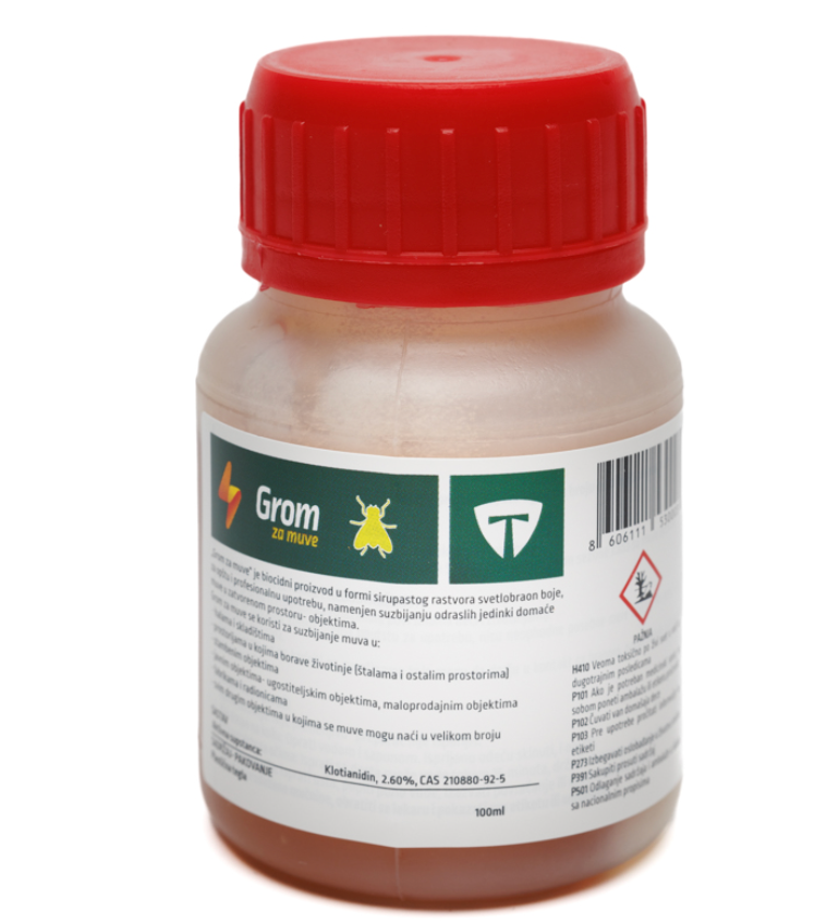 Grom za muve je biocidni proizvod u formi emulzije za opštu i profesionalnu upotrebu,namenjen za suzbijanje odraslih jedinki domaće muve u zatvorenom prostoru-objektima.Grom za muve se koristi za suzbijanje muva u-halama i skladištima-prostorijama u kojima borave životinje (štalama i ostalim prostorijama)-stambenim prostorijama-javnim objektima-ugostiteljskim objektima,maloprodajnim objektima-fabrikama i radionicama-svim drugim objektima u kojima se muve mogu naći u velikom brojuNačin upotrebe-Grom za muve se nanosi nerazblažen,premazivanjem površina izloženih muvama.