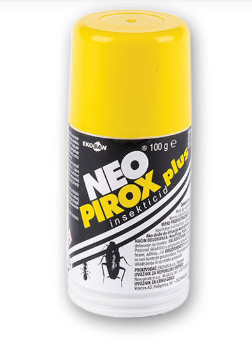 Neopirox Plus je vrhunski insekticid u formi praška koji namenjen za suzbijanje bubašvaba i mrava. Vrlo je jednostavan za upotrebu, ali što je najbitnije, bezbedan je po ukućane i kućne ljubimce. Jedini je proizvod na tržištu koji ima 1% permetrina, što čini da preparat ima pojačano i produženo dejstvo. Pogodan je za sva domaćinstva.