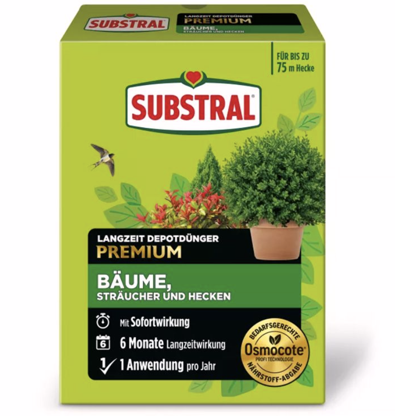 Substral dugotrajno gnojivo Osmocote za živice prilagođeno je potrebama zimzelenog šimišira, lovora, fotinije, tuje, čempresa, tise, božikovine, kaline, graba i ostalog listopadnog i zimzelenog drveća.