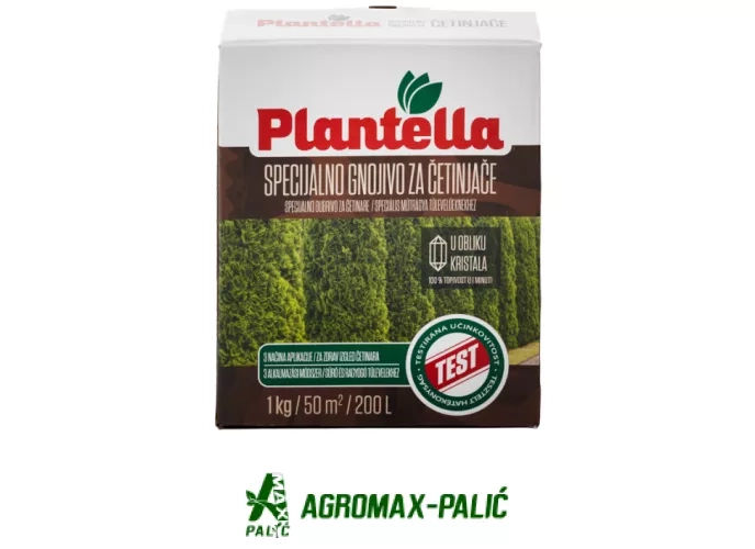 PLANTELLA ZA ČETINARE je praškasto đubrivo predviđeno za đubrenje svih vrsta četinara Osnovno đubrivo za četinare prilikom sađenja četinara, kao i prihrana tokom vegetacije. Dodatak Mg sprečeva žućenje iglica. Način primene: Sadnja:Pri sadnji četinara uneti 50-100g đubriva i pomešati sa zemljom. Dobro zaliti sa vodom. Prihranjivanje: Na početku proleća uneti 50g/m2 na rastojanju 20cm od biljke. Tokom juna uneti 25g/m2. SASTAV: Makroelementi: Ukupan azot (N): 12% Fosfor (P2O5): 5% Kalijum (K2O): 24% Sekundarni elementi: Magnezijum (MgO) 6%