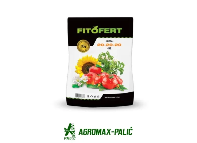 UNIVERZALNO KRISTALNO ĐUBRIVO FitoFert Kristal 20:20:20+Me je mineralno đubrivo sa izbalansiranim odnosom nutrijenata.Pošto sadrži visok sadržaj primarnih hraniva, predstavlja idealno univerzalno rešenje za folijarni tretman većine biljaka. Pogodno je za uzgoj povrtarskih kultura od perioda ukorenjivanja pa do cvetanja kao i za prihranu voćaraskih i ratarskih useva u periodu intezivnog rasta i plodonošenja pa sve do početka faze sazrevanja (pigmentacije plodova).Prilikom folijarnog tretiranja može se primenjivati samostalno ili u kombinaciji sa sredstvima za zaštitu bilja. Primena: folijarno konc. 0,3% -0,8% fertigac. konc. 0.08-0.1%.