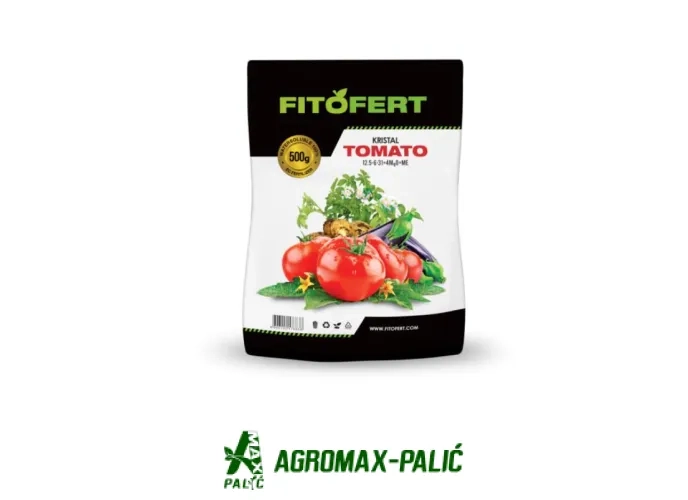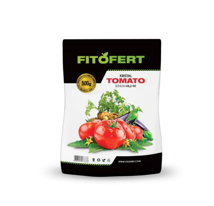 ĐUBRIVO ZA ISHRANU PARADAJZA FitoFert Kristal TOMATO 12.5:6:31+4MgO+ME je đubrivo za ishranu zasada paradajza na otvorenom i u zaštićenom prostoru. Izbalansiran odnos makro elemenata, kao i sekundarnog magnezijuma omogućuje optimalnu ishranu u svim feno fazama rasta, nakon presađivanja pa sve do sazrevanja. U zavisnosti od projektovanog prinosa, kao i od uslova gajenja preporučuju se i odgovarajuće količine po hektaru. Primena: fertigac. konc. 0.1%-0.3%.
