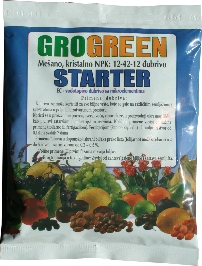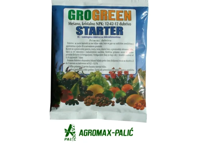 Grogreen - Starter je đubrivo sa visokim sadržajem fosfora, koji pozitivno utiče na razvoj mladih biljaka i korenovog sistema. Đubrivo se može koristiti za sve biljne vrste, koje se gaje na različitim zemljištima i supstratima u polju ili u zatvorenom prostoru. Koristi se u proizvodnji cveća, povrća, voća, vinove loze, u proizvodnji ukrasnog šiblja, kao i u svim ratarskim i industrijskim usevima. Sastav Grogreen-Starter: N 12% P 42% K 12% Fe: 0.025% Mn: 0.013% Zn: 0.004% Cu: 0.003% B: 0.010% Mo: 0.002% Mg, Ca, S / Doziranje: Folijarno (dopunsko) 0.2-0.5% Fertigacijom (kap po kap u zemljištu) 0.1% na 7 dana U hidroponici 0.05-0.1%, menjati na 7 dana Preporučena primena je u prvim fazama razvoja biljke i kod kloniranih biljaka. Šta je GROGREEN? GROGREEN su vodotopiva NPK đubriva, vrhunskog kvaliteta, namenjena različitim vidovima navodnjavanja, kao i za folijarnu primenu. GROGREEN đubriva zadovoljavaju potrebu najrazličitijih biljnih vrsta za osnovnom i dopunskom ishranom u različitim fazama porasta. U skladu sa prvoklasnim sastojcima, makro i mikroelementima i njihovom međusobnom odnosu, GROGREEN je osnova svih uspešnih i kvalitetnih programa za navodnjavanje. Zašto GROGREEN? GROGREEN đubriva u sebi sadrže sve potrebne mikroelemente. Sva đubriva su 100% vodotopiva, a mikroelementi koji se nalaze u helatnom obliku takođe su biljkama u potpunosti dostupni. GROGREEN formulacije omogućavaju tzv. uravnoteženo đubrenje, jer su stvorene na bazi kalijum nitrata, a time je izbegnuto nepotrebno podizanje soli u zemljištu. GROGREEN đubriva su proizvodi visoke čistoće i kvaliteta jer su proizvedeni od najčistijih sastojaka, bez natrijuma, hlora i teških metala. GROGREEN se može primeniti kroz bilo koji sistem za navodnjavanje, a sitne granule finih kristala koje ga čine, u potpunosti su rastvorljive u vodi.