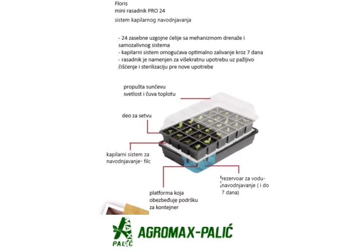 Profesionalni mini rasadnik sa naprednim sistemom kapilarnog navodnjavanja koji omogućava optimalne uslove za klijanje i rast mladih biljaka. Floris PRO 24 je idealno rešenje za sve koji žele uspešan uzgoj rasada bez svakodnevnog zalivanja.