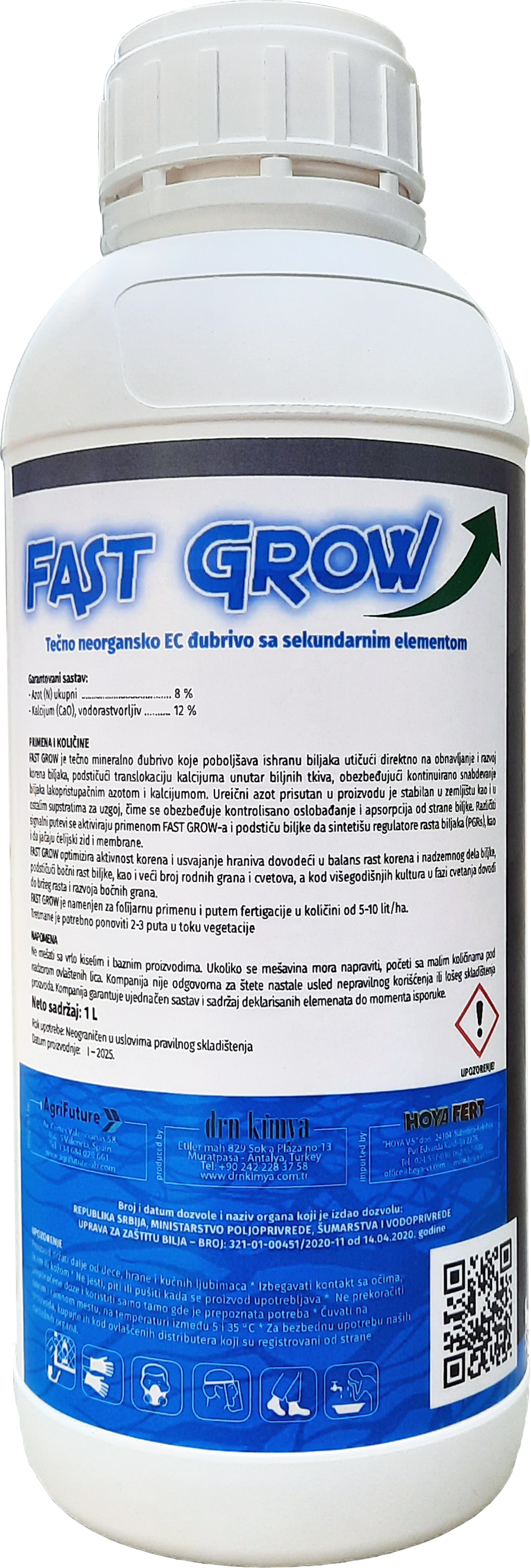 FAST GROW poboljšava fiziološku ravnotežu u biljci, podstičući kontinuirani rast korenovog sistema i translokaciju kalcijuma unutar biljnih tkiva, obezbeđujući konstantno snabdevanje biljaka lakopristupačnim azotom i kalcijumom. Ureični azot prisutan u proizvodu je stabilan u zemljištu kao i u ostalim supstratima za uzgoj, čime se obezbeđuje kontrolisano oslobađanje i apsorpcija od strane biljke. Kombinacija azota i kalcijuma u jedinstvenoj formulaciji FAST GROW štedi značajnu količinu biljne energije koja se zbog toga može koristiti u metaboličkim procesima i procesima fotosinteze. Za 20-30% smanjuje količinu potrebnog azota koji se dodaje kroz druga veštačka đubriva.