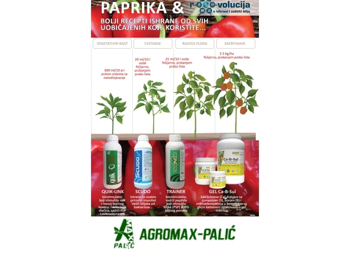 Paradajz/paprika: 6-8 kg/ha, za vreme kasnijeg vegetativnog porasta, pre cvetanja. Ponoviti posle zametanja i za vreme sazrevanja plodova.