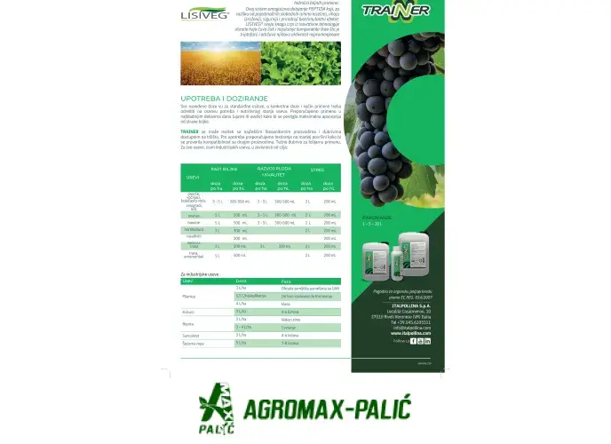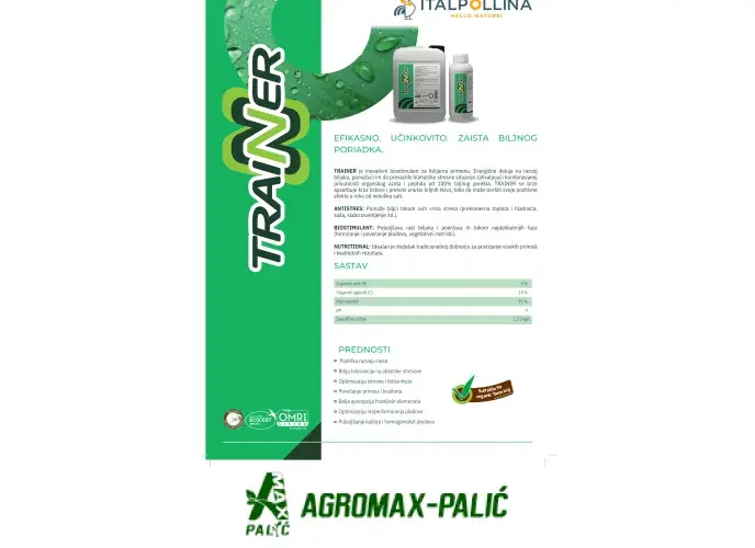 TRAINER je tečno organsko azotno đubrivo na bazi aminokiselina biljnog porekla za folijarnu primenu. Prisutnost organskog azota omogućava da proizvod bude energetski aktivan u razvoju biljaka, pomažući takođe prevazilaženje klimatskih stresnih situacija. TRAINER se brzo absorbuje preko lista i translocira se u tkivu biljke i u roku od nekoliko sati može da izvrši svoje dejstvo u biljci.