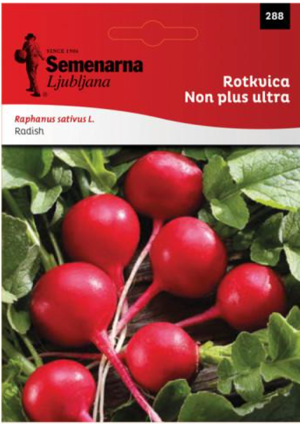 Seme klija 8-10 dana. Rana sorta. Ukusne i sočne rotkvice su velike, okrugle i intenzivno crvene boje. Semena je za oko 2 m2.