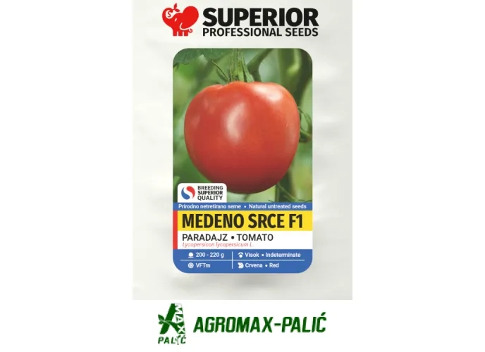 Seme paradajza Medeno Srce F1. Ovaj domaći hibrid razvijen je kao ukusnija i otpornija alternativa popularnom Volovskom srcu. Medeno Srce F1 kombinuje odličan ukus sa većom otpornošću na bolesti i stabilnim prinosom. Stablo je robusno, sa obiljem lisne mase koja dobro štiti plodove od ožegotina. Na svakoj cvetnoj etaži formira 4–5 srcolikih plodova prosečne mase oko 250 g, a u optimalnim uslovima plodovi mogu dostići i preko 500 g. Ovaj hibrid je naročito cenjen među proizvođačima koji direktno prodaju na pijacama zbog atraktivnog izgleda i vrhunskog ukusa.