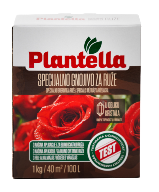 PLANTELLA ZA RUŽE je specijalno mineralno đubrivo u praškastoj formi namenjeno za prihranu ruža. Način primene: Može se koristiti unošenjem u zemljište ili zalivanjem. Đubrivo uneti u zemljište u blizini ruža u količini od 20-50g/m2. Dobro zaliti vodom. Prvo đubrenje izvršiti u martu, drugo pred cvetanje, treće po precvetavanju. SASTAV: Makroelementi: Ukupan azot (N): 12% Fosfor (P2O5): 9,5 % Kalijum (K2O): 10% Sekundarni elementi: Magnezijum (MgO) 6%