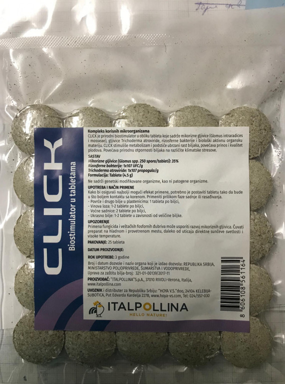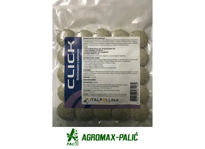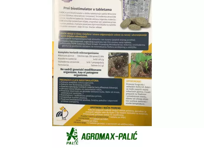 Prvi biostimulant u tabletama. Konzorcijum korisnih mikrooranizama. NE SADRŽI GENETSKI MODIFIKOVANE ORGANIZME, KAO NI PATOGENE ORGANIZME. Biostimulant sačinjen od korisnih mikro-organizama CLICK je prvi biostimulant u obliku tableta koji sadrži mikorizne gljive (Glomus intraradices), Trichoderma atroviride, rhizosphere bacteria i biološki aktivnu organsku materiju. Stimuliše metabolizam, poboljšava razvoj biljke, poboljšava prinos i razvoj plodova. Takođe pojačava odpornost useva na klimatske stresove. Starter efekat. Da bi se obezbedio dobar efekat, smestiti proizvod gde može ostvariti najveći kontakt sa korenom. Preporučujemo upotrebu prilikom presađivanja.