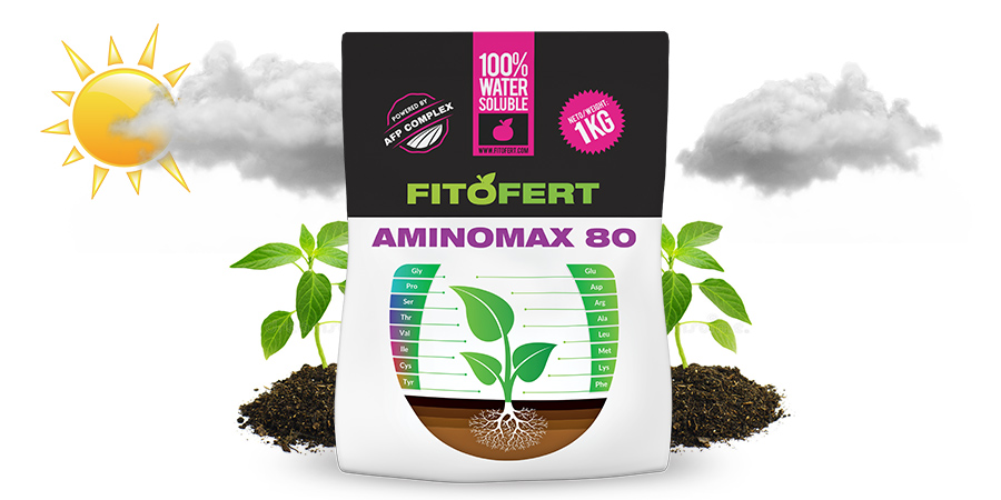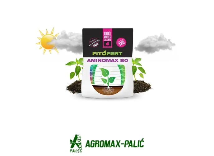 FITOFERT AMINOMAX 80 je đubrivo u obliku vodorastvornog praha, sa visokim sadržajem esencijalnih L amino-kiselina, namenjeno za uspešnu borbu protiv stresnih uslova kao i kod oporavka biljaka od posledica stresa, izazvanog visokim ili niskim temperaturama. Proizvod je formulisan od amino-kiselina (L-izomera) biljnog porekla, dobijenih enzimatskom hidrolizom. Pozitivni efekti delovanja amino-kiseline su višestruki, helatizacija mikrolelemenata i njihov intenzivniji transport kroz sprovodne sudove, sinteza fitohormona, polenizacija i oplodnja. Tretirati pre pojave stresnih uslova. Kompatibilan je sa svim folijarnim đubrivima.