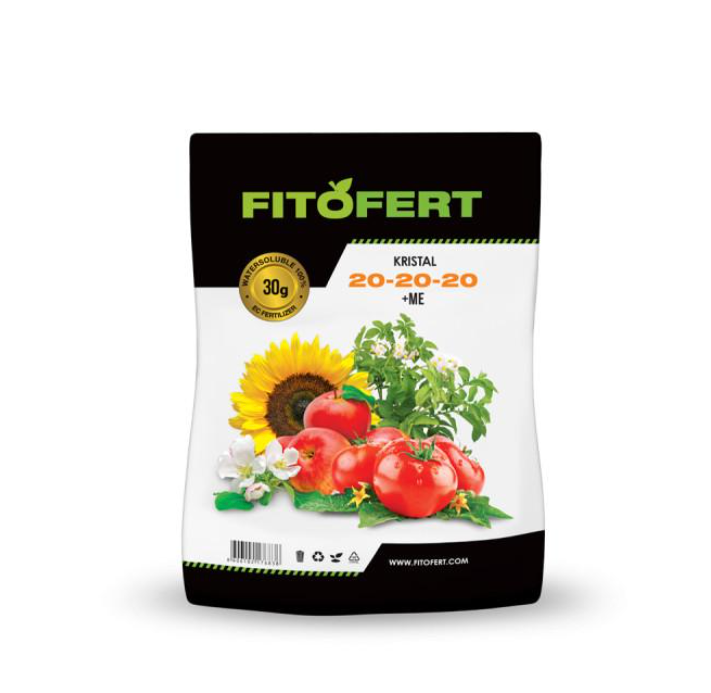 UNIVERZALNO KRISTALNO ĐUBRIVO FitoFert Kristal 20:20:20+Me je mineralno đubrivo sa izbalansiranim odnosom nutrijenata.Pošto sadrži visok sadržaj primarnih hraniva, predstavlja idealno univerzalno rešenje za folijarni tretman većine biljaka. Pogodno je za uzgoj povrtarskih kultura od perioda ukorenjivanja pa do cvetanja kao i za prihranu voćaraskih i ratarskih useva u periodu intezivnog rasta i plodonošenja pa sve do početka faze sazrevanja (pigmentacije plodova).Prilikom folijarnog tretiranja može se primenjivati samostalno ili u kombinaciji sa sredstvima za zaštitu bilja. Primena: folijarno konc. 0,3% -0,8% fertigac. konc. 0.08-0.1%.