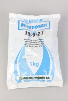 Neorgansko složeno čvrsto NPK đubrivo sa mikroelementima (B, Cu, Fe, Mn,Zn), kristalna vodotopiva đubrivo Doza, koncentracija: 0,5-2,5g/l vode Preporučena količina, vreme i način primene: Murtonik 19:9:27 je đubrivo koje se primenjuje u različitim kulturama (povrće, voće, vinova loza) posle formiranja plodova, u krompiru posle cvetanja, u ratarskim kulturama najčešće uz herbicidne ili fungicidne tretmane.
