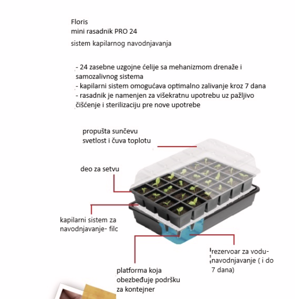 Profesionalni mini rasadnik sa naprednim sistemom kapilarnog navodnjavanja koji omogućava optimalne uslove za klijanje i rast mladih biljaka. Floris PRO 24 je idealno rešenje za sve koji žele uspešan uzgoj rasada bez svakodnevnog zalivanja.