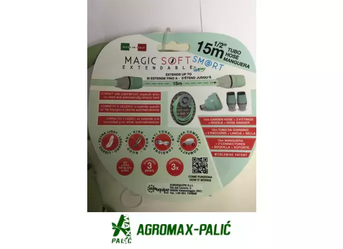 - Fleksibilno i lagano; - Patentirano - 100% Made in Italy; - Proširivo od 2x do 3x; - Anti-kink i anti-torziona struktura; - Uključuje dva originalna priključka; - 6 uključenih mlaznica; - Ne samo za vrt, već i za kampere, brodove, terase, balkone, ... - Inovativno pakovanje dugog životnog veka: plastična vreća za višekratnu upotrebu; - Ušteda prostora; - Ekološki.