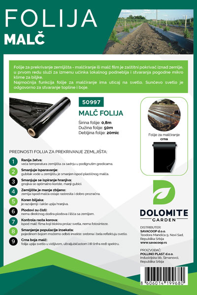 Folije za prekrivanje zemljišta-malčiranje su zaštitni pokrivač iznad zemlje, koji u prvom redu služi za izmenu učinka lokalnog podneblja i stvaranja pogodne mikro klime za biljke. Prednosti folije za malčiranje: ranija žetva, smanjenje isparavanja, smanjenje ispiranja hranjiva, manje zbijeno zemljište, koren biljaka je razvijeniji i lakše upija hranjiva, čisti plodovi, kontrolisan rast korova. Dimenzije: Širina folije: 0.8m Dužina folije: 50m Debljina folije: 20mic
