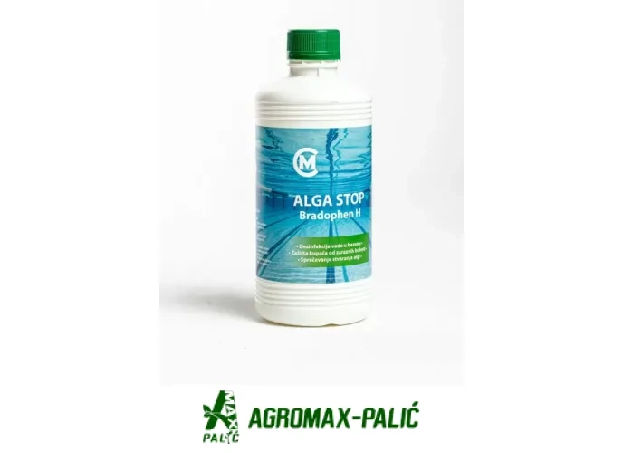 Uputstvo za upotrebu: Pre punjenja bazena napraviti rastvor od 200ml Bradophena H u 10 litara vode pa sa tim rastvorom prebrisati dno bazena i zidove pa zatim napuniti bazen sa vodom. • Izvršiti šok tretman vode sa hlornimT-granulatom • Posle 48 sati dodati 100ml Bradophen H na 5m3 vode • Posle 7 dana dodaje se od 50 do100ml Bradophena H na 5m3 vode,nedeljno.
