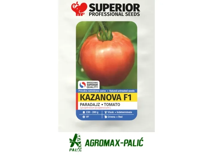 Seme paradajza Kazanova F1. Srednje rani hibrid sa visokim i bujnim biljkama namenjen za otvoreno polje uz oslonac. Kazanova F1 se odlikuje izuzetno krupnim, mesnatim i čvrstim plodovima, što ga čini idealnim za profesionalne proizvođače koji traže stabilan prinos i tržišno atraktivan paradajz.