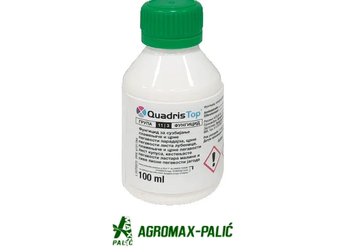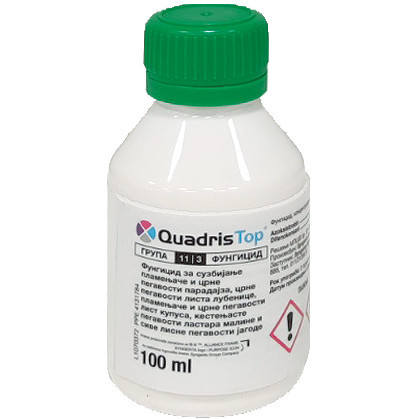 QUADRIS® TOP je sistemični fungicid sa preventivnim, kurativnim i eradikativnim delovanjem. Primenjuje se za suzbijanje prouzrokovača sušenja lastara maline (Dydimella applanata), plamenjače (Phytophthora infestans) i crne pegavosti (Alternaria solani) paradajza, sive pegavosti lista jagode (Mycosphaerella fargariae), plamenjače kupusa (Peronospora parasitica), crne pegavosti lista lubenice i kupusa (Alternaria spp.).
