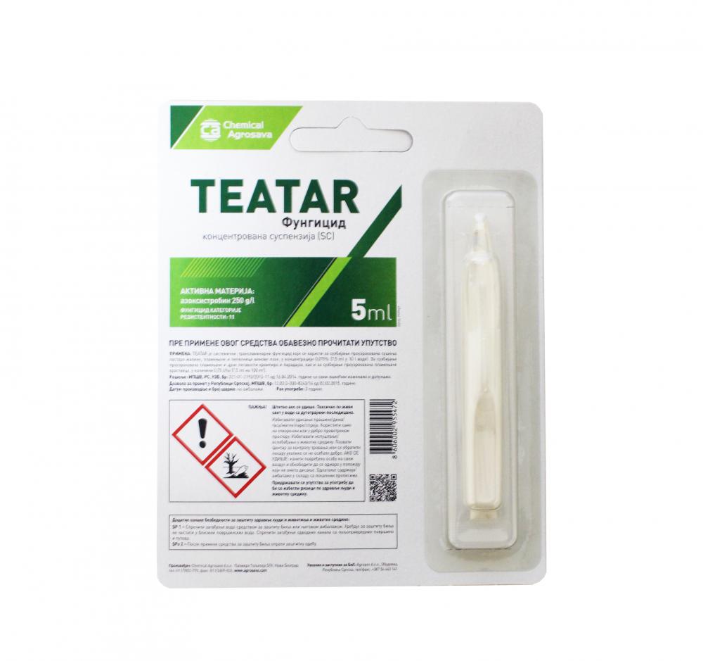 Teatar je lokalsistemični fungicid na bazi aktivne materije azoksistrobin sa preventivnim i kurativnim delovanjem. Teatar je u povrtarskoj proizvodnji posebno namenjen za suzbijanje bolesti kao što su plamenjače koje se brzo razvijaju. Inhibira klijanje spora i rast micelija, a ima i antisporulaciono delovanje. Iz tog razloga njegova primena je preventivna sa izvesnim kurativnim delovanjem na razvoj micelije plamenjače u biljnom tkivu. Da bi se izbegla pojava rezistentnosti, Teatar treba koristiti u alternaciji sa aktivnim materijama koje imaju multi-site efekt kao što su fluazinam (Niveral), mankozeb (Mankosav) itd. Preparat se u toku godine može primeniti dva puta na istoj površini. Preparati na bazi azoksistrobina imaju širok spektar delovanja na biljne bolesti, kratku karencu i izražen fiziološki efekat (zeleni efekat) na biljke, čime zauzimaju posebno mesto u zaštiti povrća.